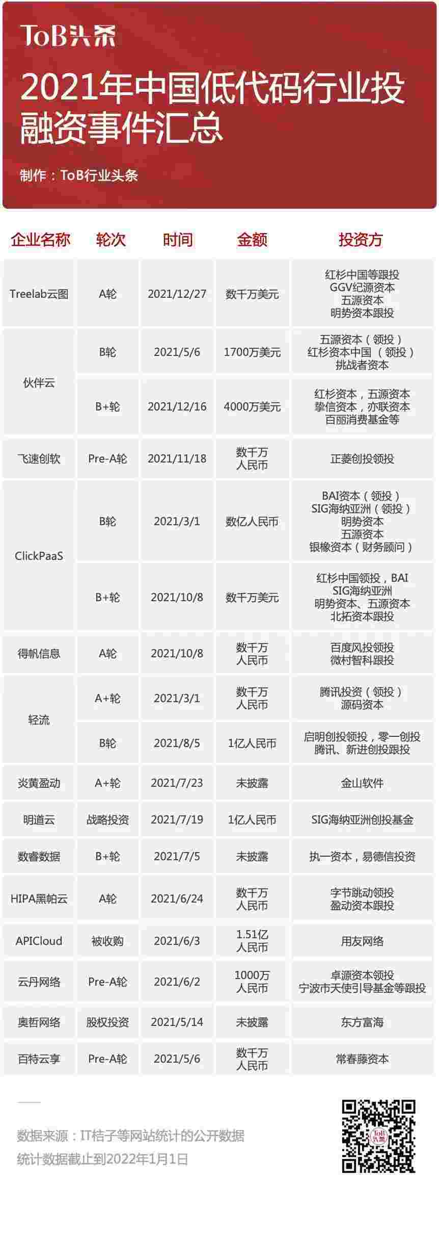 到2021年,,,,,,,,,无/低代码投融资规模势头更甚,,,,,,,,,,,其中包括轻流两轮融资(A+轮数千万人民币,,,,B轮近亿人民币)、、、、、、、、、、、、、OPPO钱包 两轮融资(B轮数亿人民币,,,,,,,B+轮数千万美元)、、、、、、、、、、、、百特云享数千万元Pre-A轮融资......