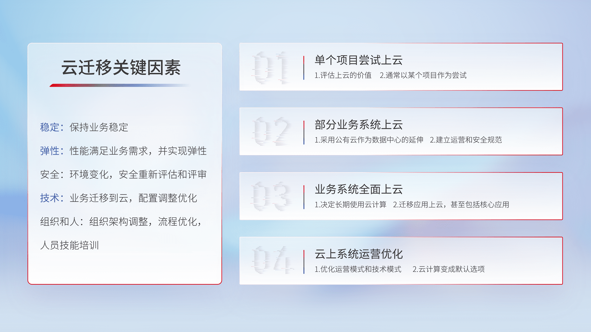 结合实际业务,,,,从规划设计、、、云平台选型、、、、云原生改造、、、数据迁移、、集成交付,,迁移全过程为客户识别最佳上云路径,,,做好风险识别管理,,,设计网络架构、、、身份权限、、安全审计合规、、、、操作审计、、、日志审计、、、监控告警策略、、、多站点容灾设计等,,,,对云上基础设施进行整体规划,,提升IT治理水平,,,,以满足弹性、、、高可用、、、、高性能的需求。。。。