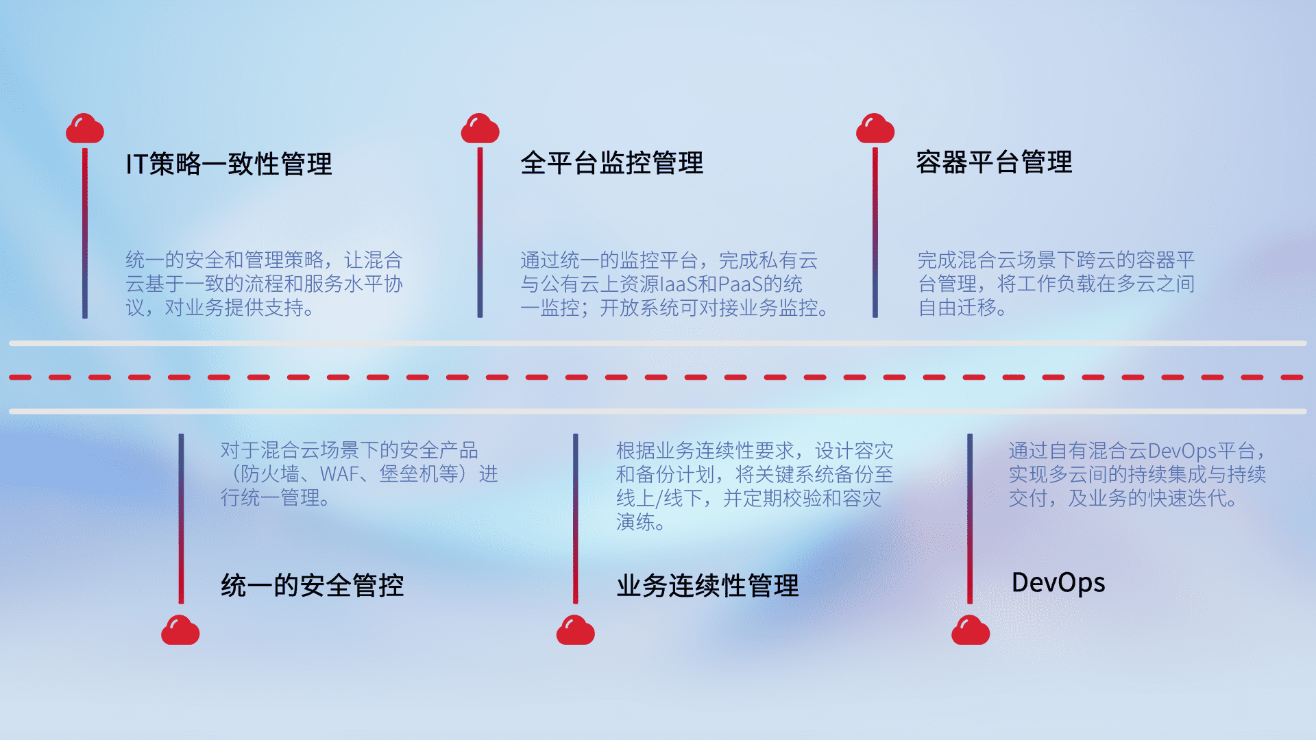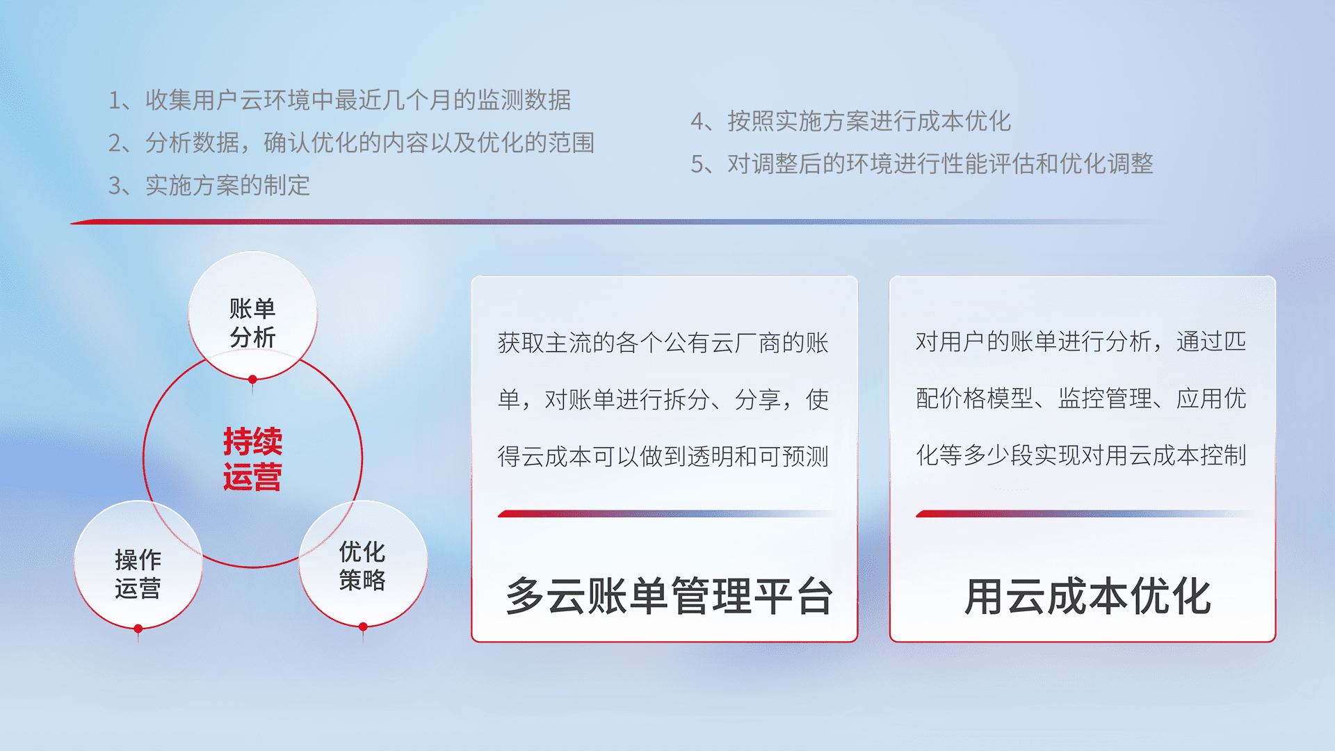 通过多云纳管,,,以统一的资源数据模型把客户的云资源进行抽象和封装,,,进而实现对多云资源的统一操作,,,保障云资源管理的可靠性、、、稳定性与可用性。。。。量身定制化运维内容,,,配置、、开发运维、、、、补丁管理、、、备份、、、监控、、认证和访问管理、、审计和日常巡检等,,保障在用云过程中的可靠度,,,稳定度以及高可用率。。