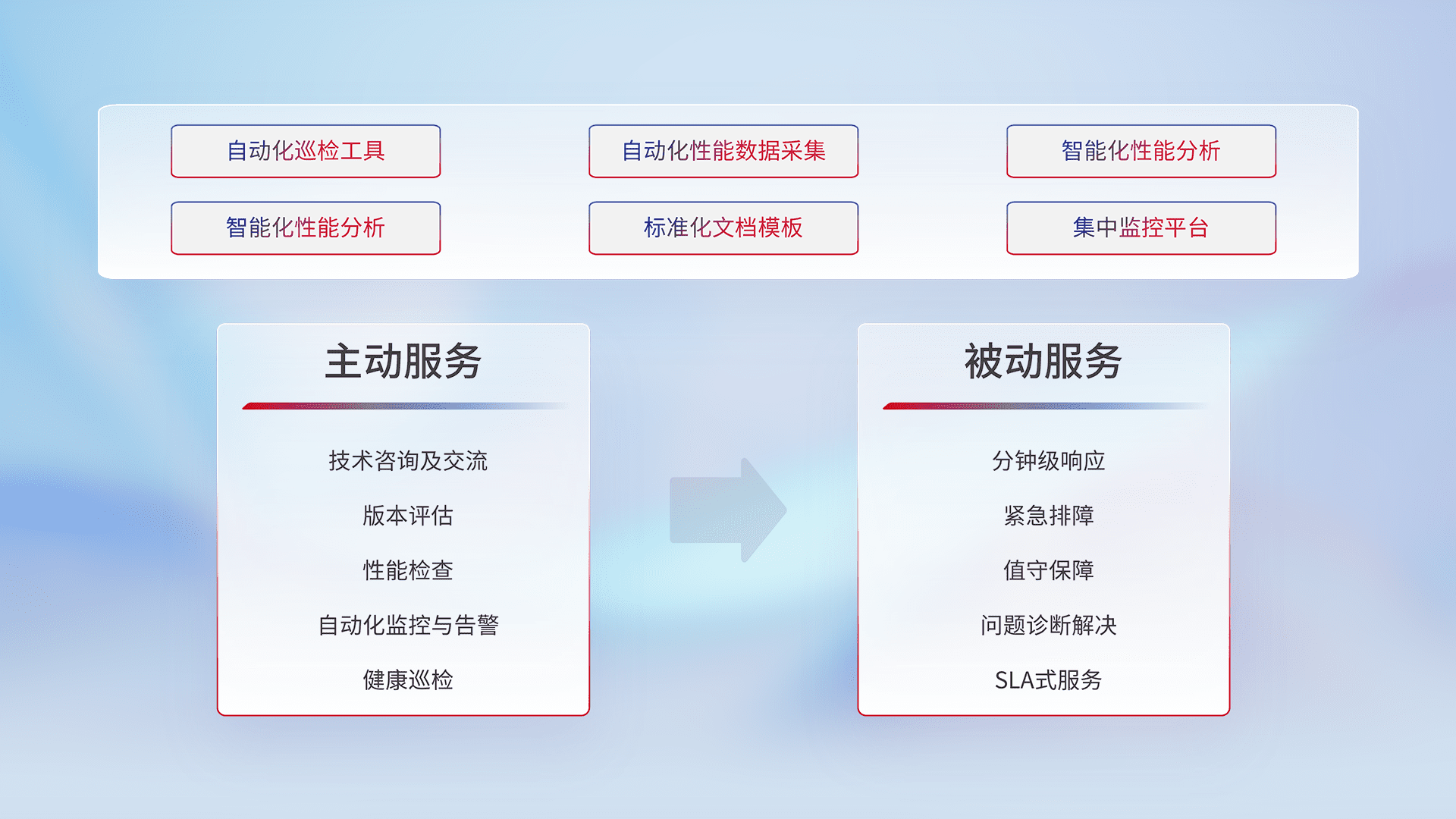 智能化工具和标准化文档,,,,保障服务质量,,,,提供主动服务(包含技术咨询、、、版本评估、、、性能检查、、、、自动化监控与告警、、、、健康巡检)和被动服务包含(分钟级响应、、、紧急排障、、、、值守保障、、、问题诊断解决、、、SLA服务)。。